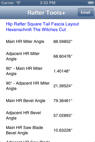 The user interface is a lot better on the iPhone than the Rafter Tools app for Android. Real easy to use, especially the Email calculations function and the Equal - Unequal Overhang function for irregular hip roofs. The Timber Framing angles screen is pretty good. You can select different display formats for the Timber Framing angles. The hip angles display is a lot easier to read on the iPhone.