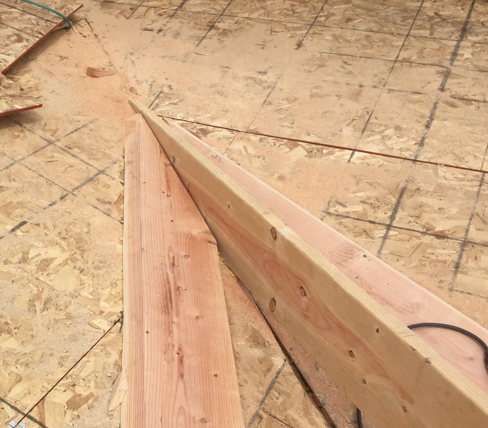 The ridge cut has a 4:17 miter angle to set on top of the main roof valley rafter. I scribed the miter angle for the valley sleepers at the peak.